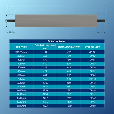 Our DP Return Rollers are designed to be mounted underneath the conveyor belt, providing essential support to the return side of the belt. Built for durability and smooth rotation, they help reduce belt wear and maintain proper belt alignment, ensuring efficient and reliable conveyor performance. Ideal for use in a variety of bulk handling applications.