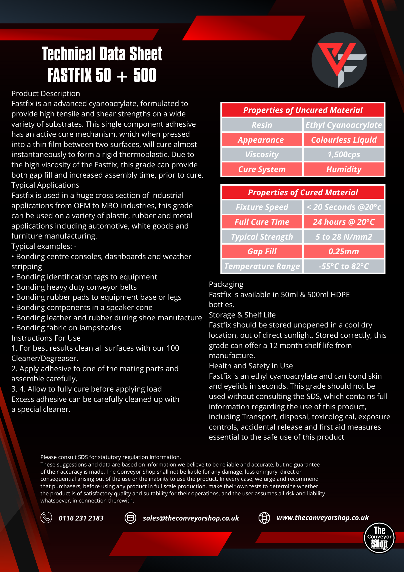 FastFix 50 is a high-performance adhesive designed specifically for conveyor belt repair and maintenance. FastFix 50 provides a quick, strong, and reliable bond for rubber, fabric, and other belt materials.